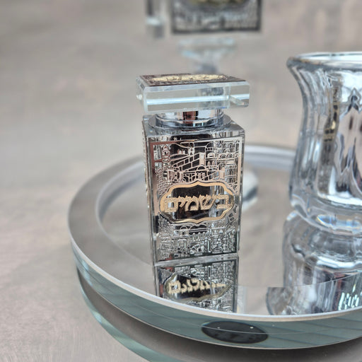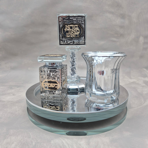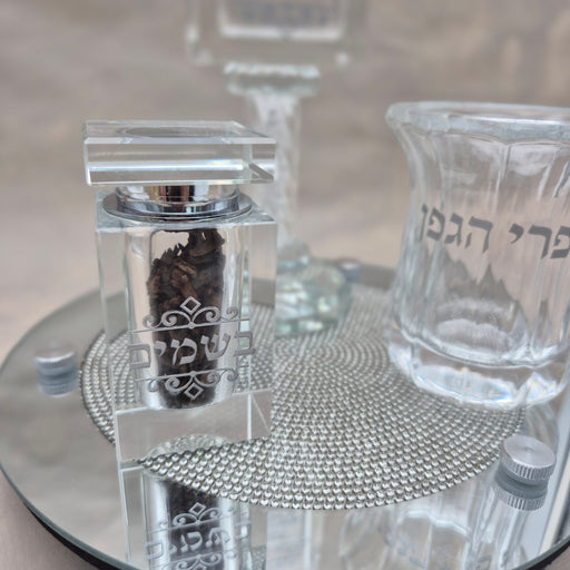 סט הבדלה מקריסל שקוף מהמם עם בשמים ובפנים עץ ציפורן גביע קידוש ומעמד לנר