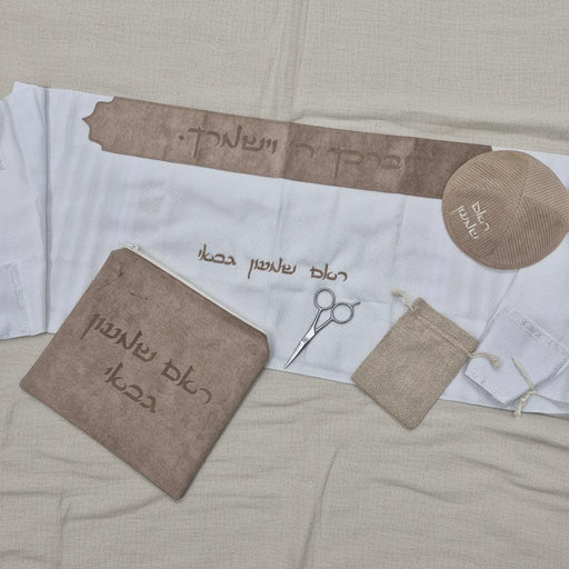 מארז חאלקה פרימיום בחיתוך לייזר הכולל : טלית חאלקה פרימיום בד נגד החלקה עם עטרה בצבע חום מקטיפה "יברכך ה' וישמרך" מחיתוך לייזר + שם ושם משפחה - גו...
