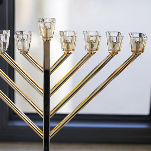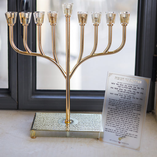 חנוכיית חבד בצבע זהב מגיע עם ברכון פרספקט מתנה עשויה ממתכת זהב ובסיס קריסטל ראשי קריסטל מהודרים גובה 32 ס''מ