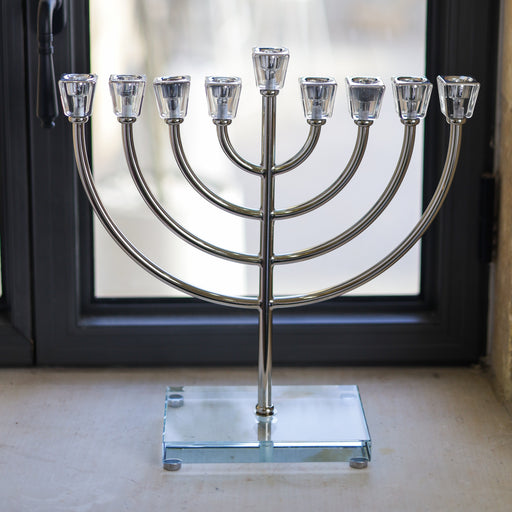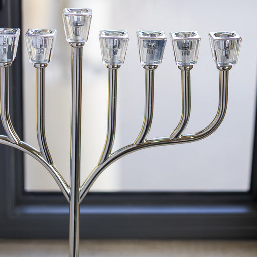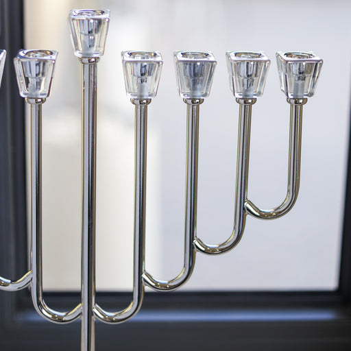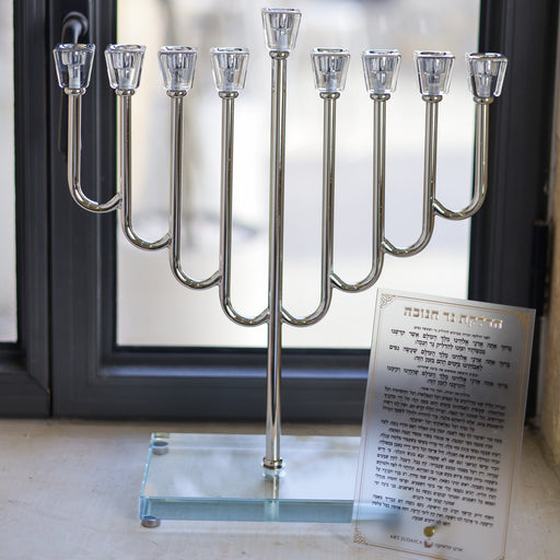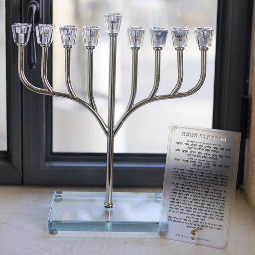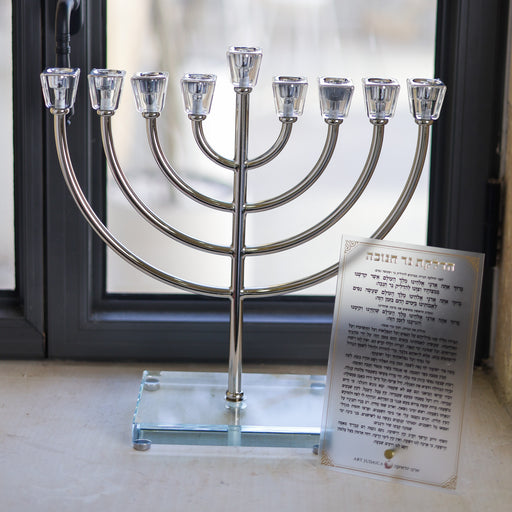 חנוכיית אור בצבע כסף מגיע עם ברכון פרספקט מתנה עשויה ממתכת כסף ובסיס קריסטל ראשי קריסטל מהודרים גובה 37 ס''מ