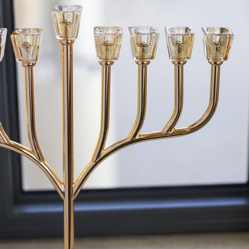 חנוכיית אור בצבע זהב מגיע עם ברכון פרספקט מתנה עשויה ממתכת זהב ובסיס קריסטל ופלקטה בזהב ראשי קריסטל מהודרים גובה 37 ס''מ
