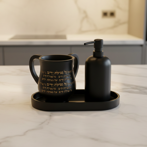 נטלה מהודרת מפוליריזן צבע לבן אפור בעיצוב פס זהב עם ברכת על נטילת ידיים גובה הנטלה 14 ס''מ