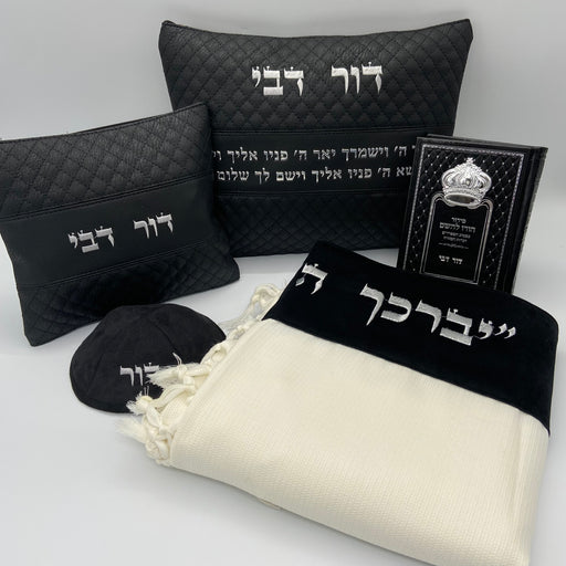 סט חתנים יברכך שחור מהודר הכולל: סט כיסויים לטלית ולתפילין שחור ברכת כהנים עם הבלטה עם רקמת השם ושם משפחה טלית צמר רחלים בית יוסף 100% צמר טהור, מד...