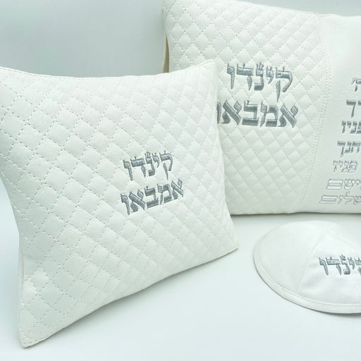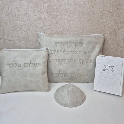 סט כיסויים לטלית ולתפילין צבע אבן דמוי עור עם ברכת כהנים ושם בחיתוך לייזר ייחודי בלעדי לרקמת המלך
