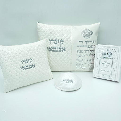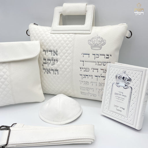 מארז כיסוי טלית תפילין יברכך לבן הכולל: סט כיסויים לטלית ולתפילין לבן עם רקמת ברכת כהנים ורקמת השם ושם משפחה סידור כתר לבן הודו להשם נוסח ספרדי ועד...