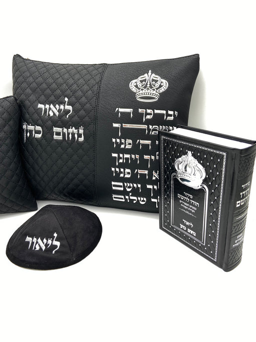 מארז קדושה מהודר הכולל : 1. סט כיסויים טלית תפילין שחור ברכת כהנים בהטבעה עם רקמת השם(ללא עלות נוספת) 2. סידור כתר שחור כסף מהודר נוסח ספרדי ועדות...
