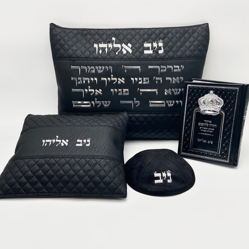 מארז כיסוי טלית תפילין יברכך כתר שחור הכולל: סט כיסויים לטלית ולתפילין שחור עם הבלטת ברכת כהנים כתר ורקמת השם ושם משפחה סידור כתר שחור הודו להשם נו...