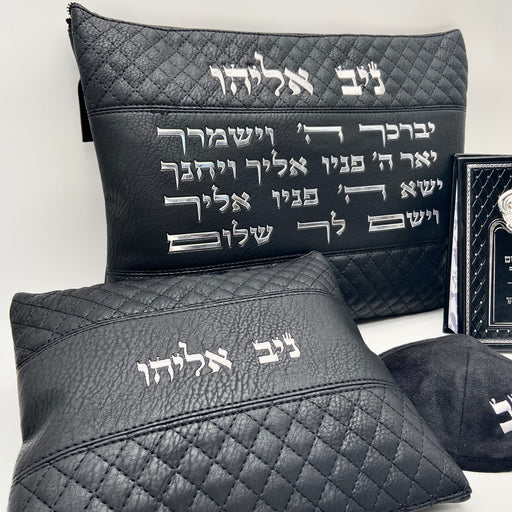 כיסוי טלית תפילין יברכך הבלטה מהודר הכולל: סט תיק נשיאה לטלית ולתפילין צבע שחור דגם לואי עם אותיות כסף מובלטות של ברכת כהנים וכתר עם רקמת השם כולל ...