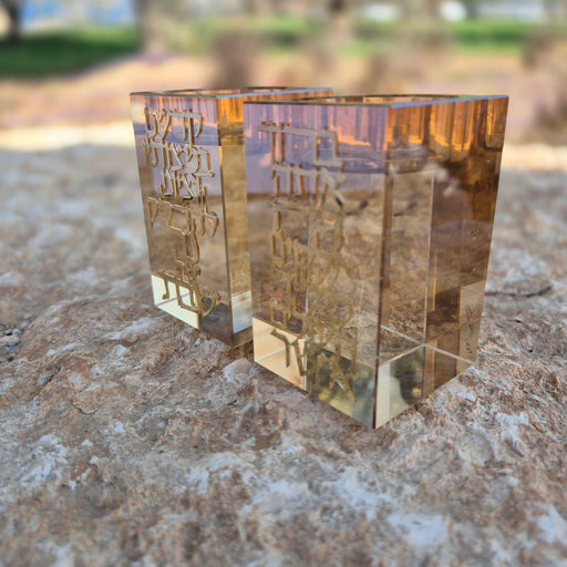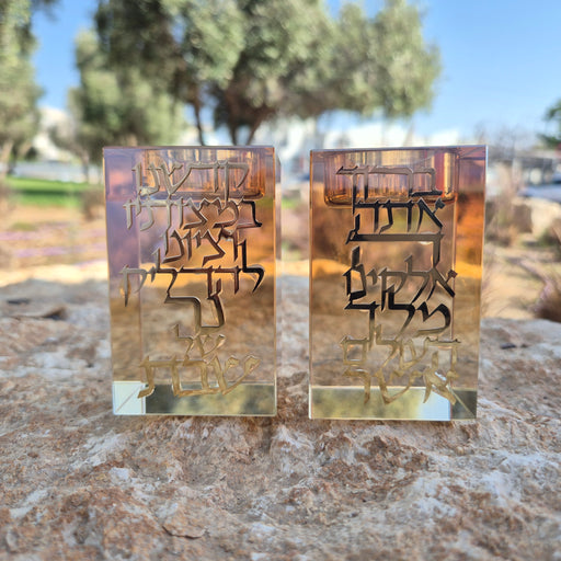 זוג פמוטים לשבת מקריסטל איכותי וברכת הדלקת נרות מפלקטת ברזל בצבע זהב גובה הפמוטים 8 ס''מ