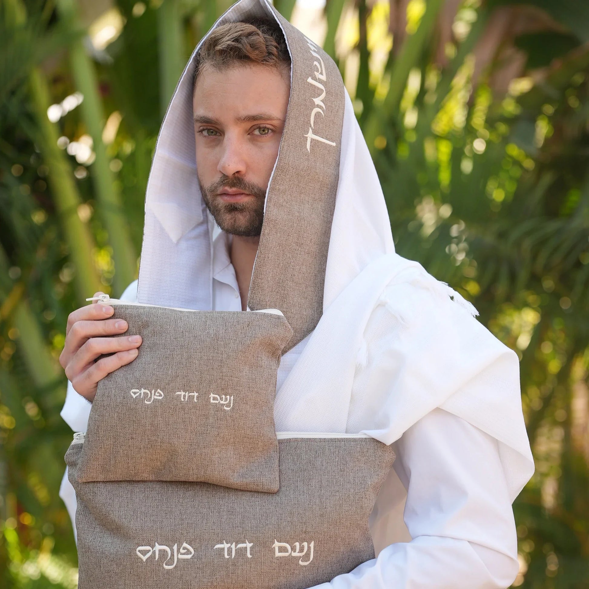 מארז לחתן פשתן חום כיסויים וטלית צמר Premium