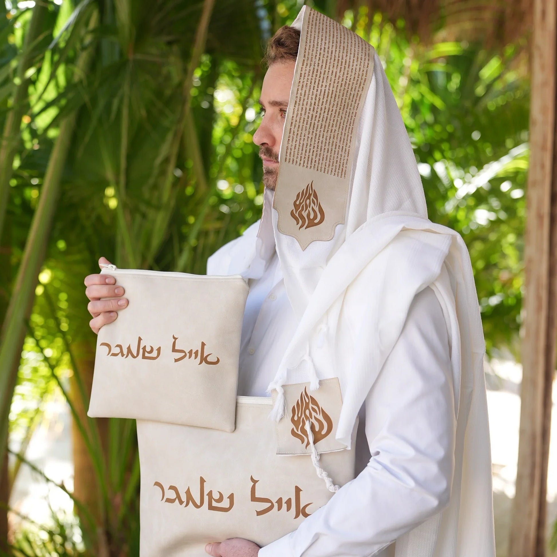 מארז לחתן תיקון הכללי דמוי עור בז כיסויים וטלית צמר Premium