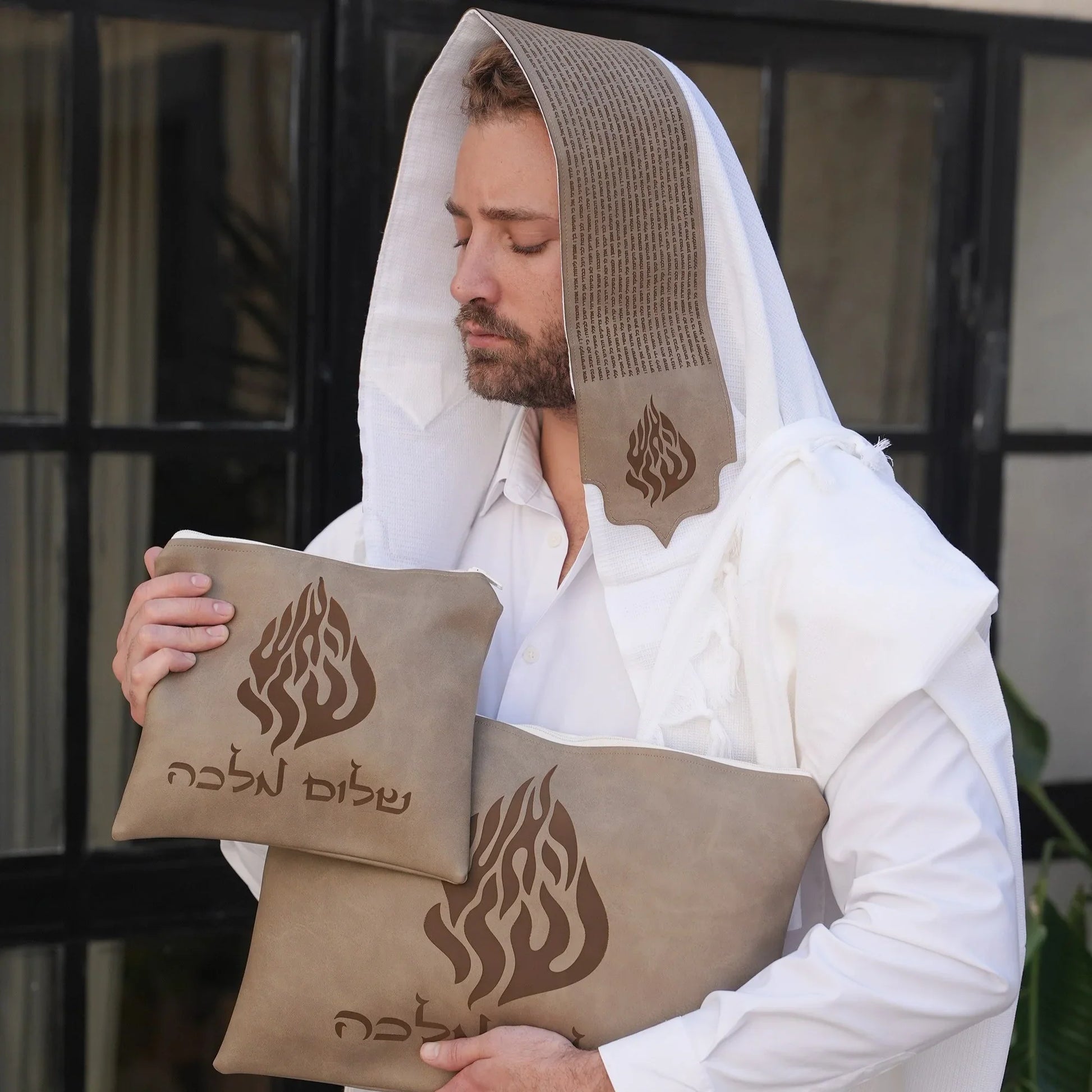 סט כיסויים לטלית ולתפילין מבית רקמת המלך דמוי עור יוקרתי בגוון חום