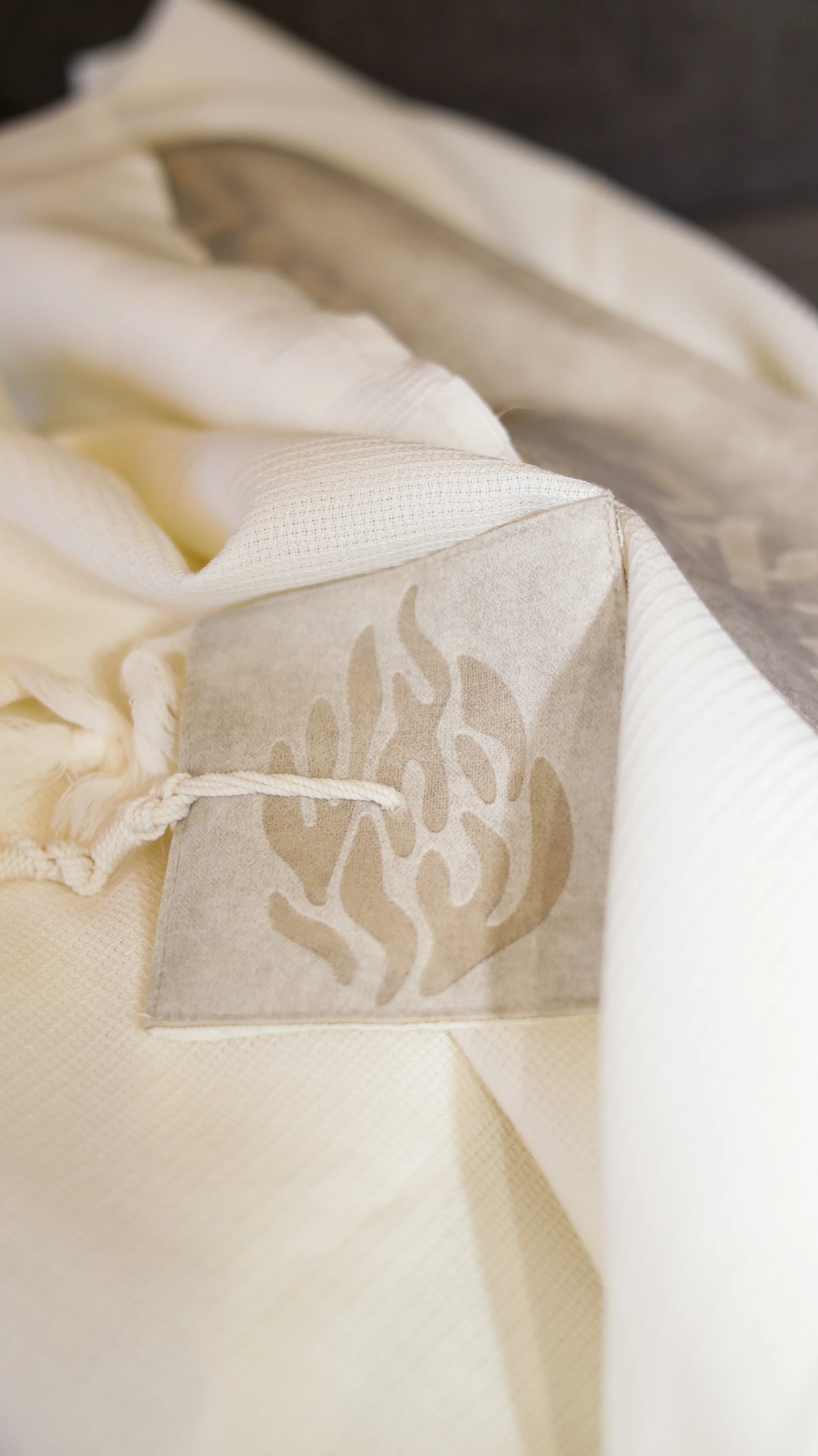 על הטלית עטרה מבד קטיפה מיוחד "האש שלי תוקד עד ביאת המשיח" בחיתוך לייזר ייחודי 4 פינות הטלית עם האש שלי בחיתוך לייזר מיוחד