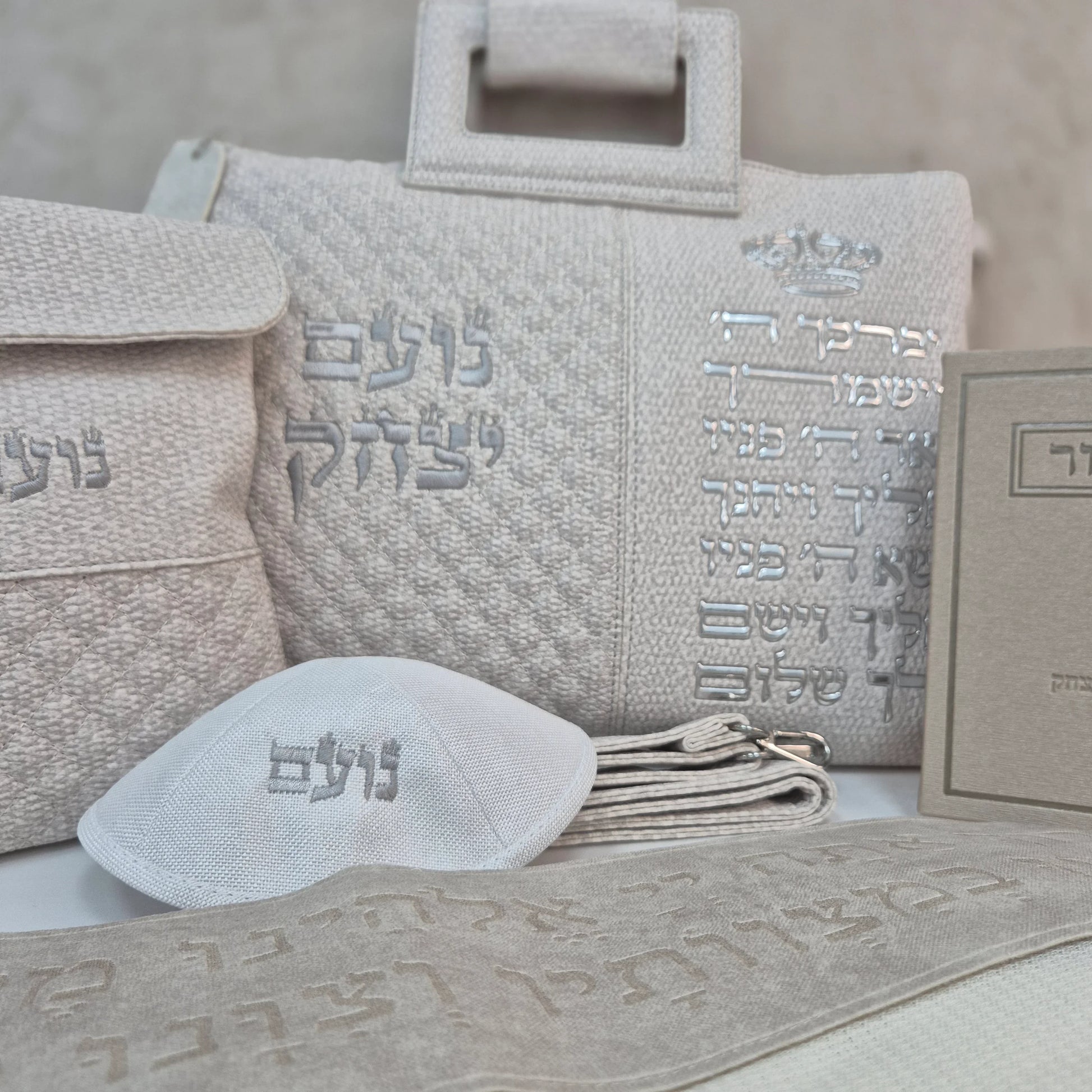 תיק נשיאה לטלית ולתפילין מדמוי עור איכותי צבע בז עם הבלטת ברכת כהנים כולל רקמת השם ושם משפחה