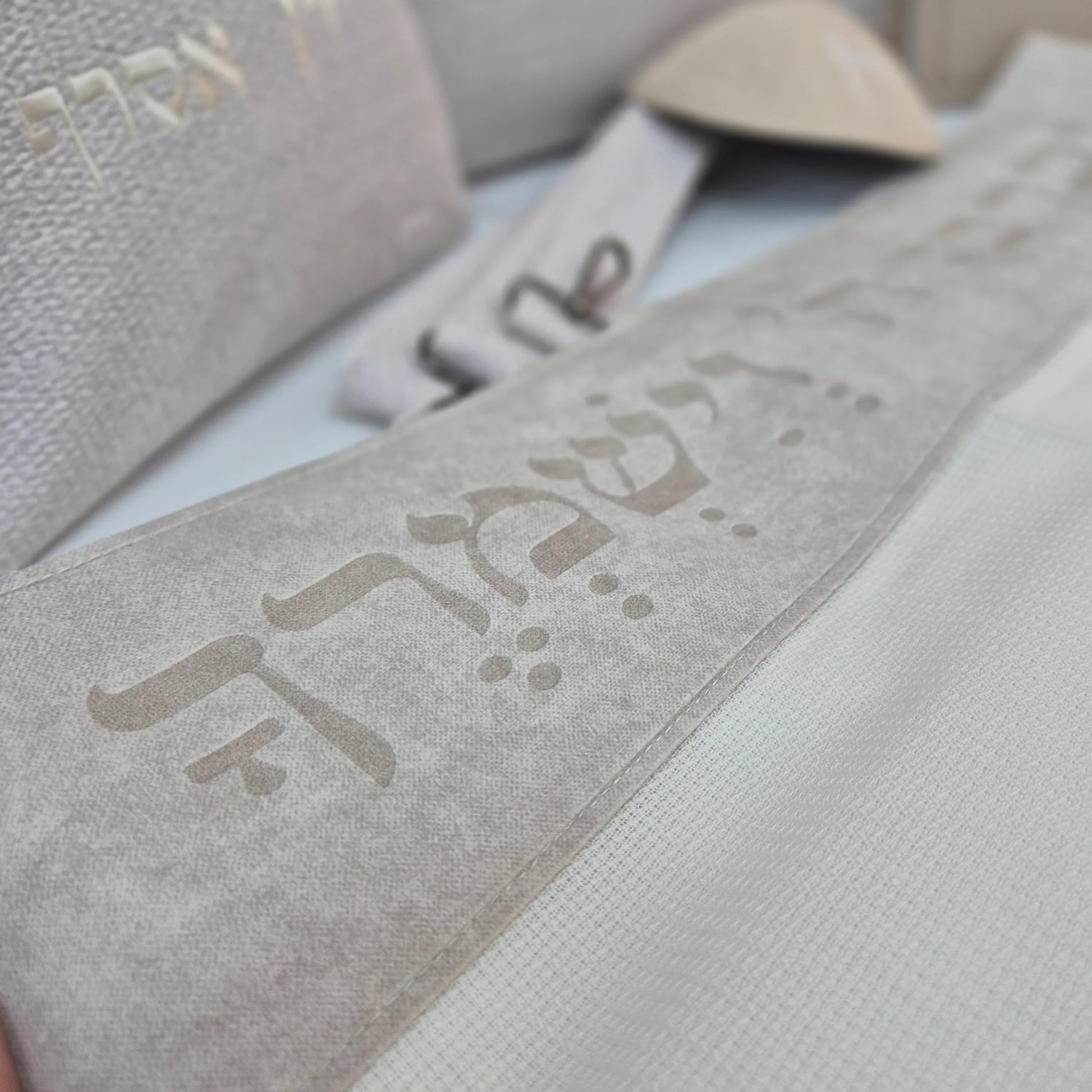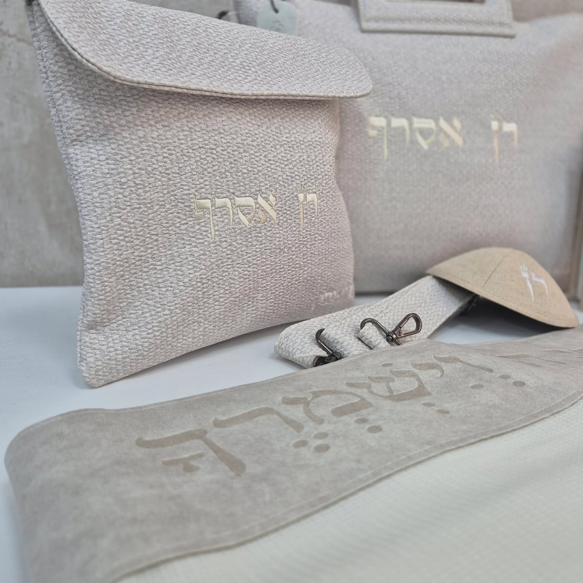 תיק נשיאה לטלית ולתפילין מדמוי עור איכותי צבע בז עם בטקסטורת פשתן מיוחדת כולל רקמת השם ושם משפחה