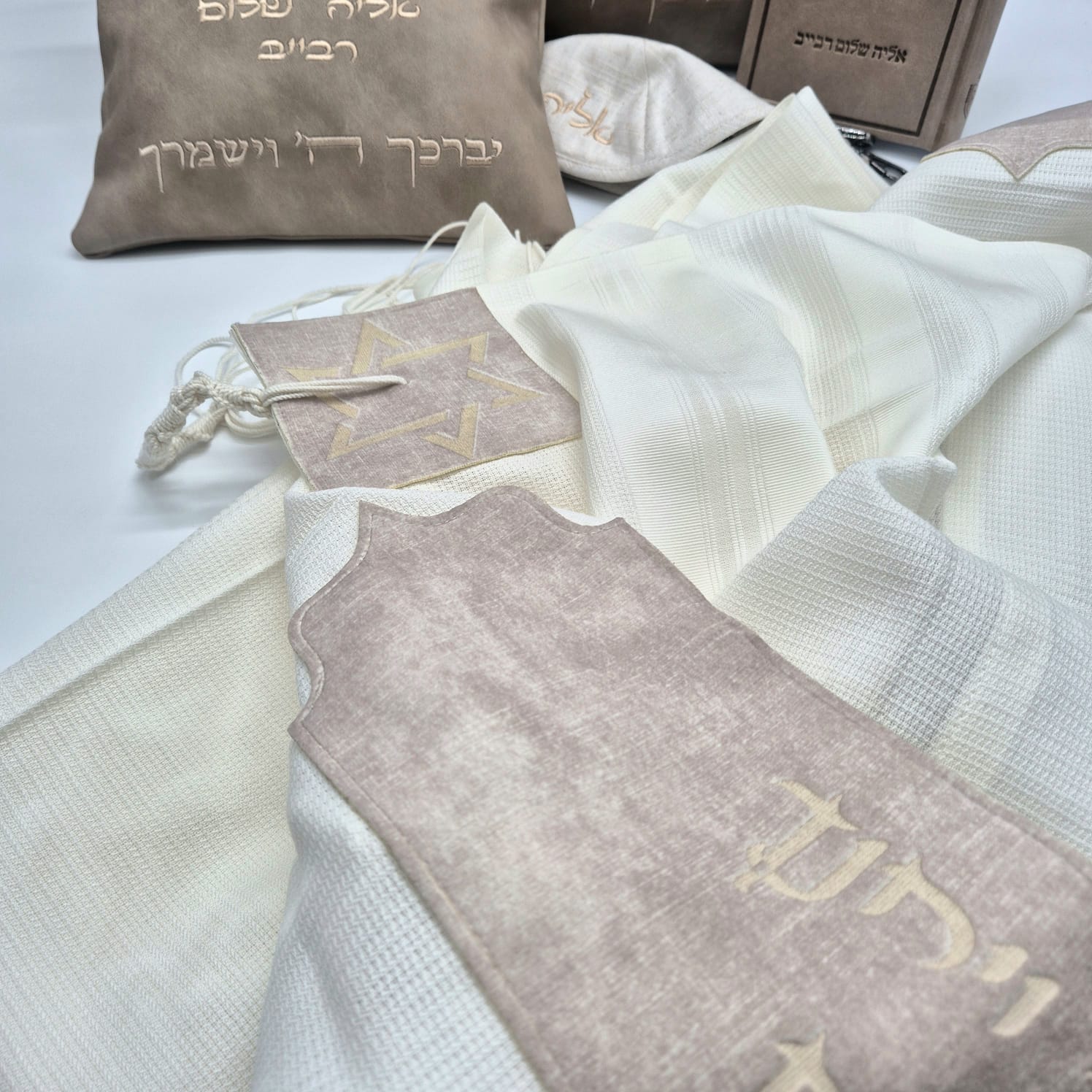 סט חתנים חום עם טלית צמר חיתוך לייזר עם סידור וכיפה