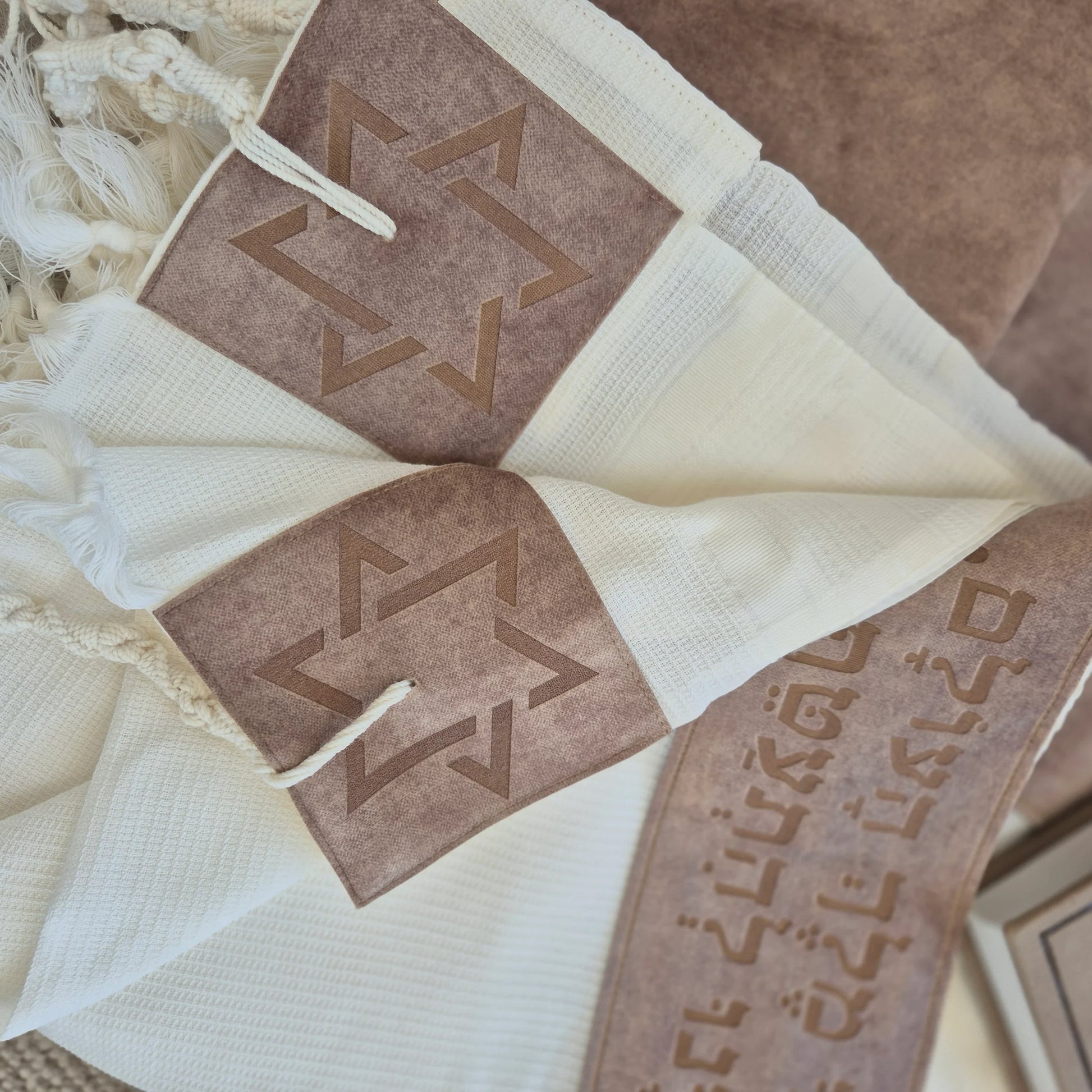 על הטלית עטרה מבד קטיפה מיוחד וברכת הציצית בחיתוך לייזר ייחודי 4 פינות הטלית עם מגני דוד בחיתוך לייזר מיוחד