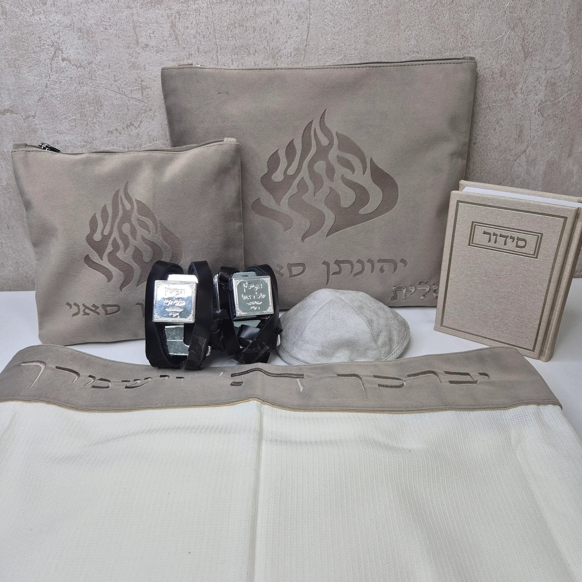 תיק טלית תפילין מקטיפה איכותית עם חיתוך לייזר חדשני האש שלי וחריטת השם ושם משפחה